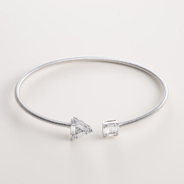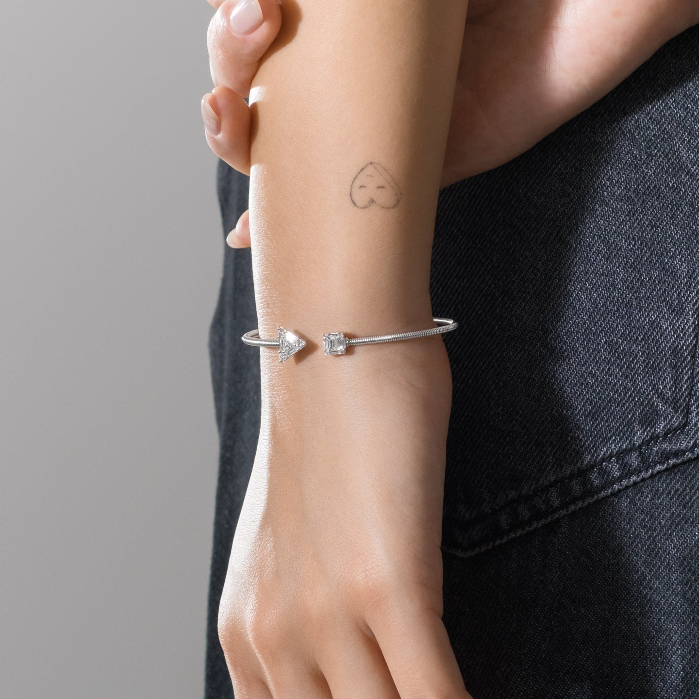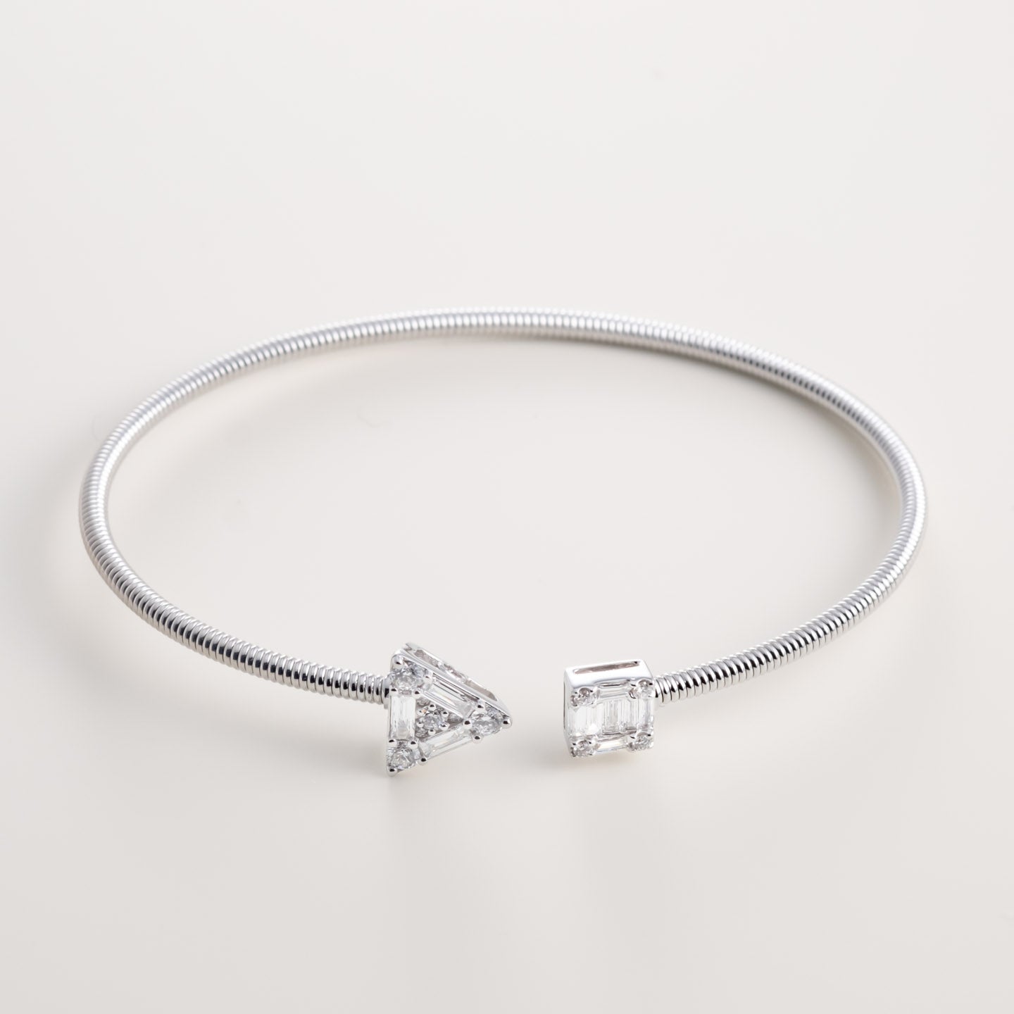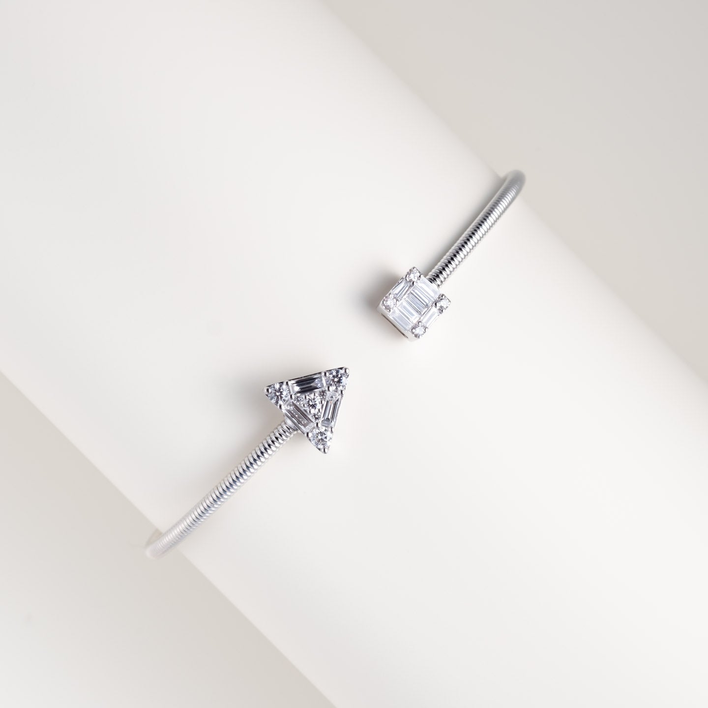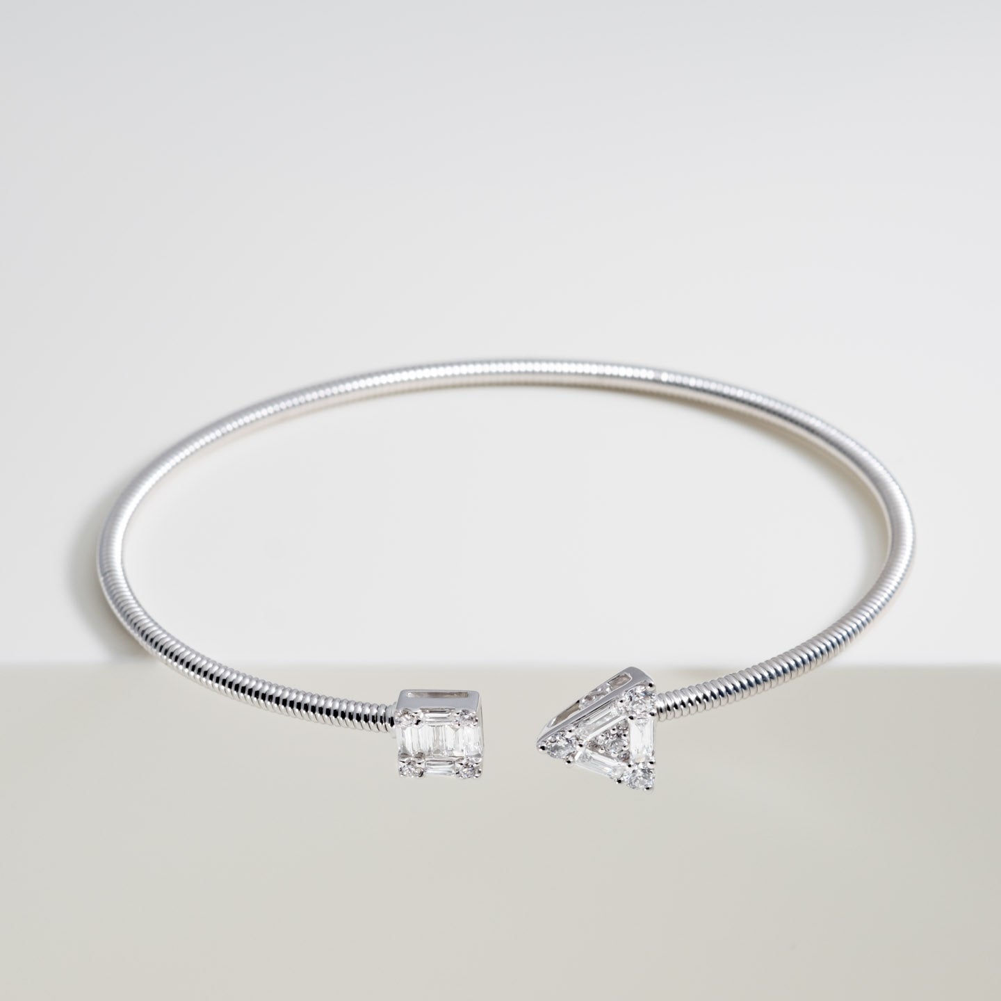 A celestial illusion: white baguette diamonds, set with near-invisible precision in 18K white gold, appear to float in motion around a coiled titanium bangle.