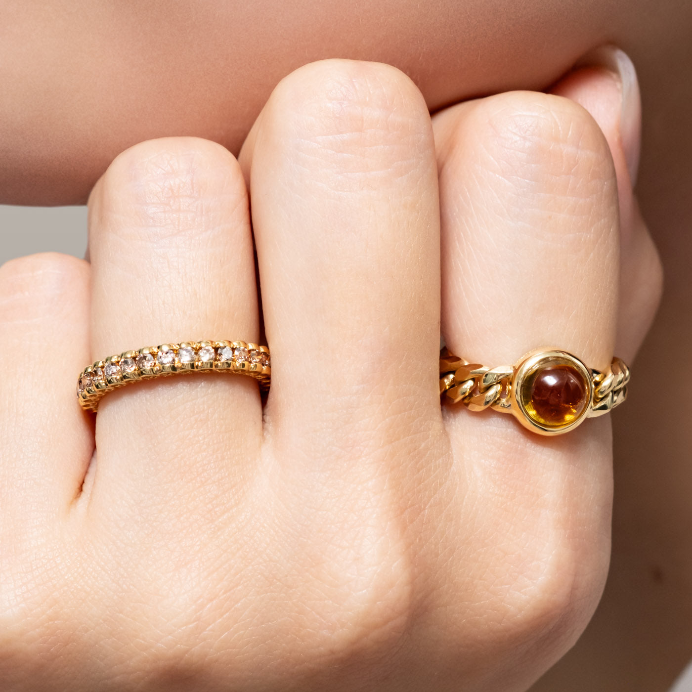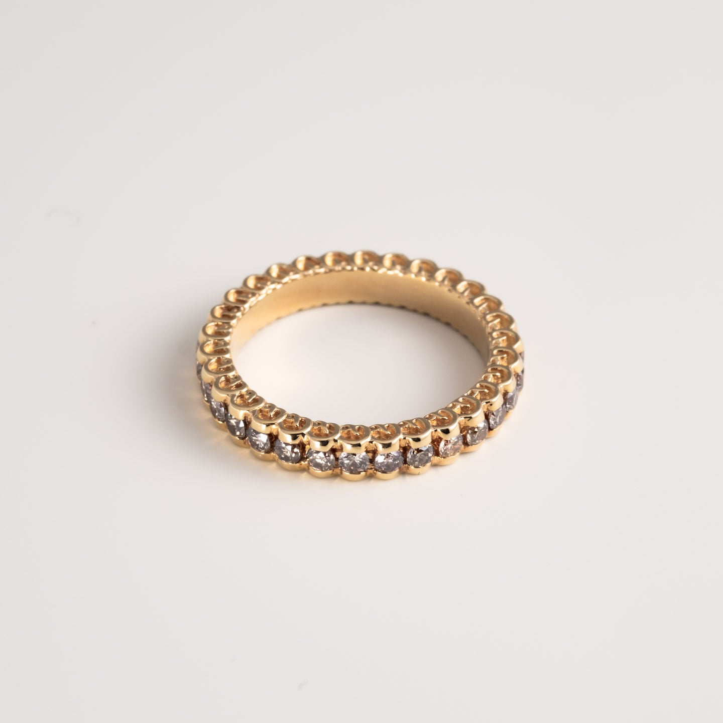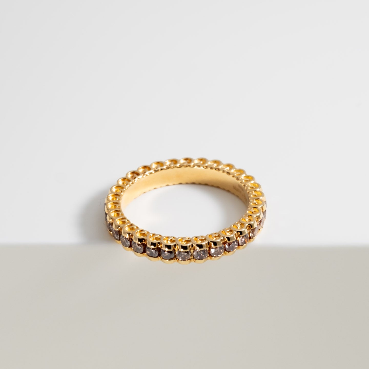 The Signature Brown Diamond Eternity Band—a modern essential set in 18K yellow gold with brown diamonds from our collection. Designed for daily wear, its discreet D logo along the band edges is both a nod to our attention to detail and practicality, protecting both the ring and your other jewelry from scratches.