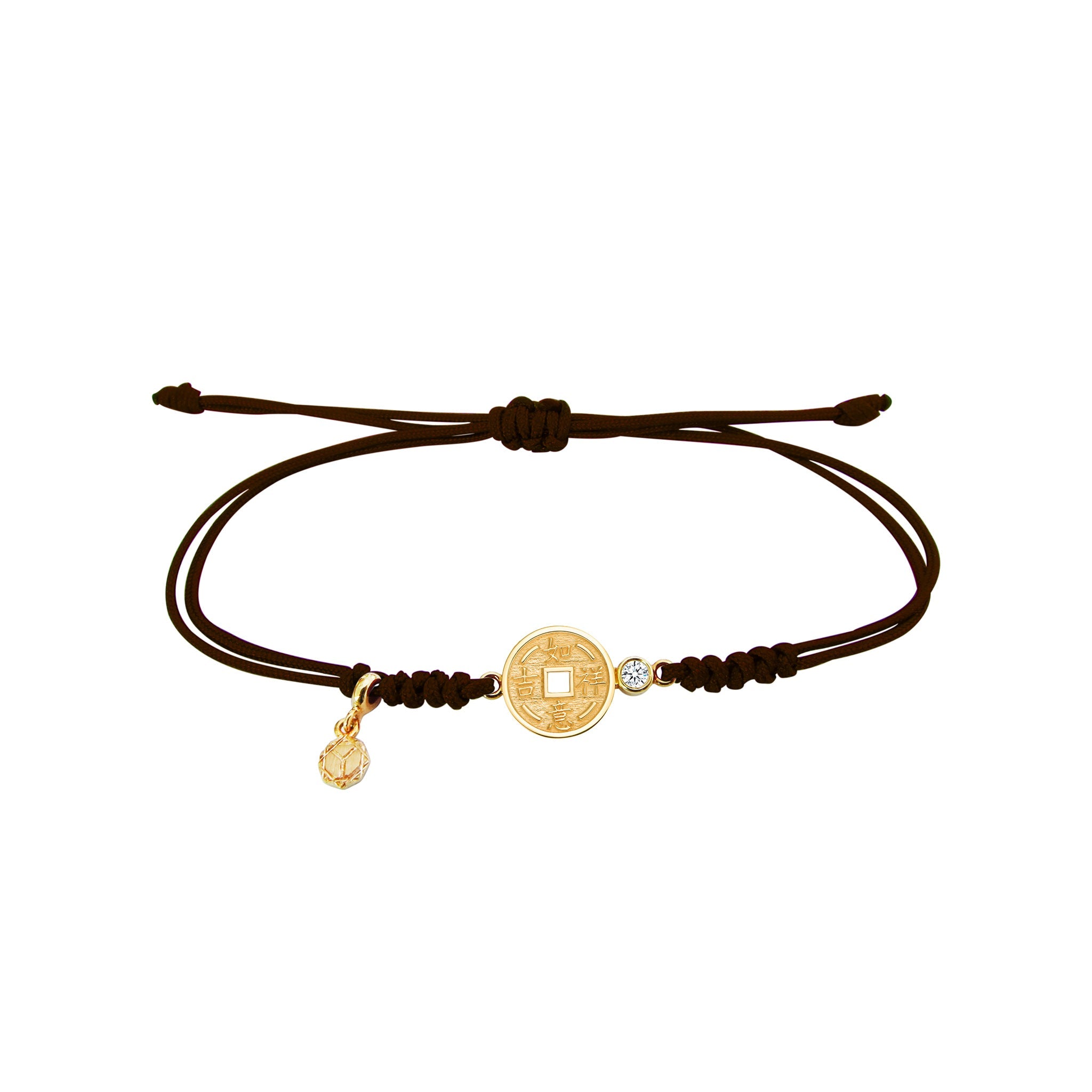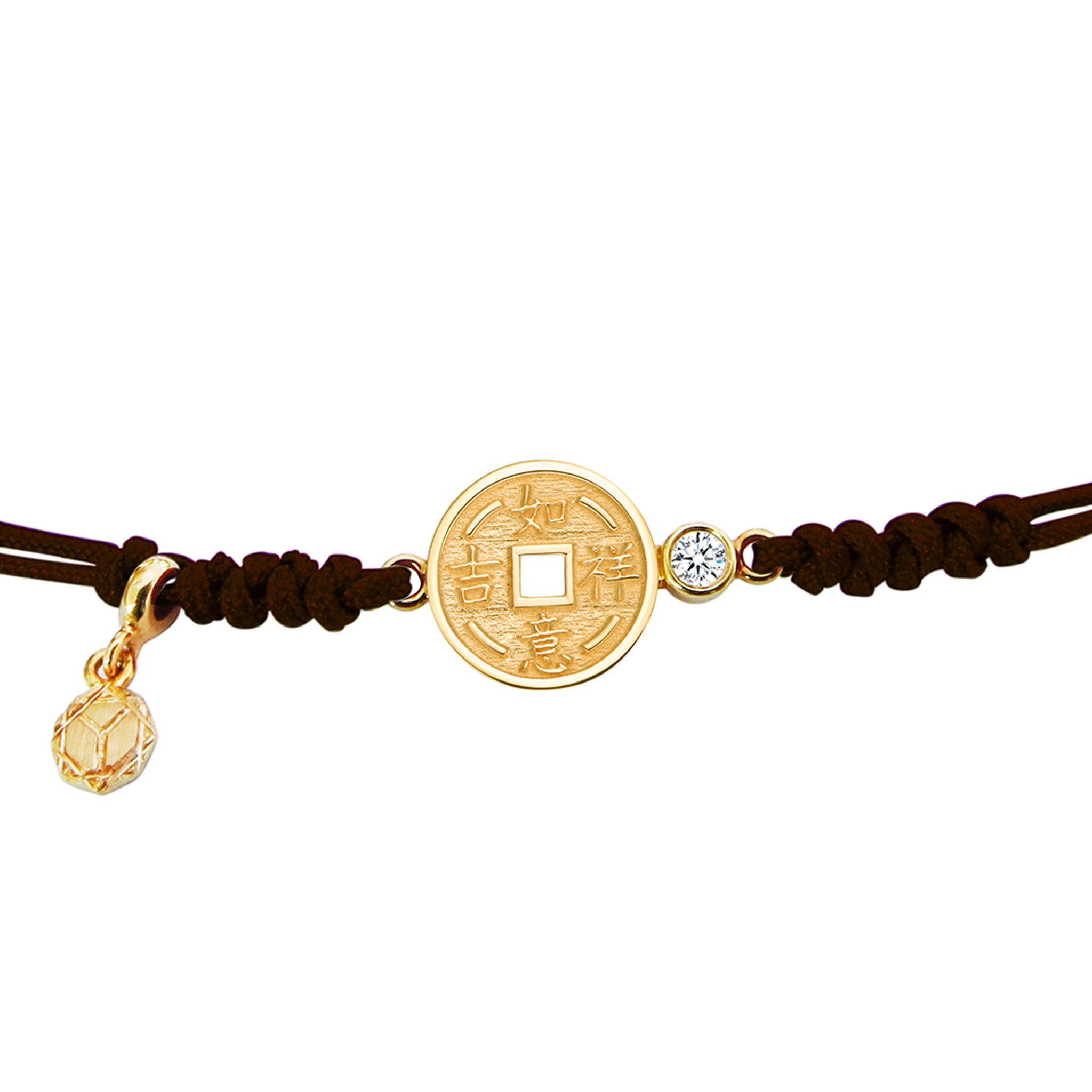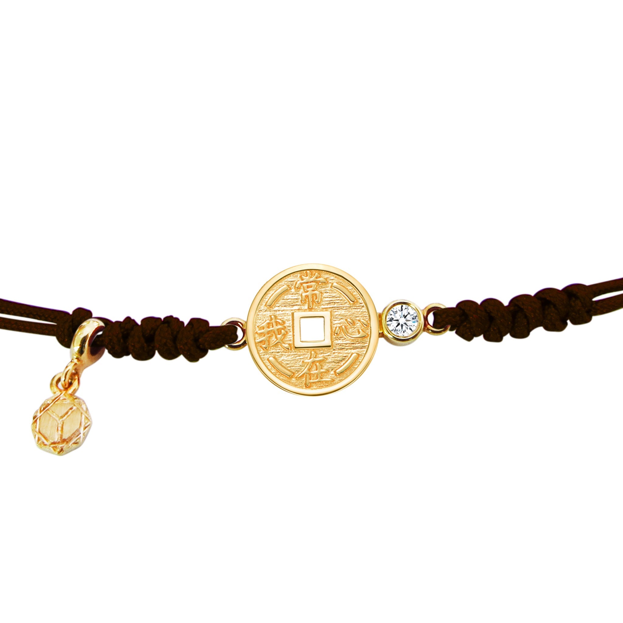 Lucky Coin Diamond Yellow Gold Thread Bracelet, with Blessing