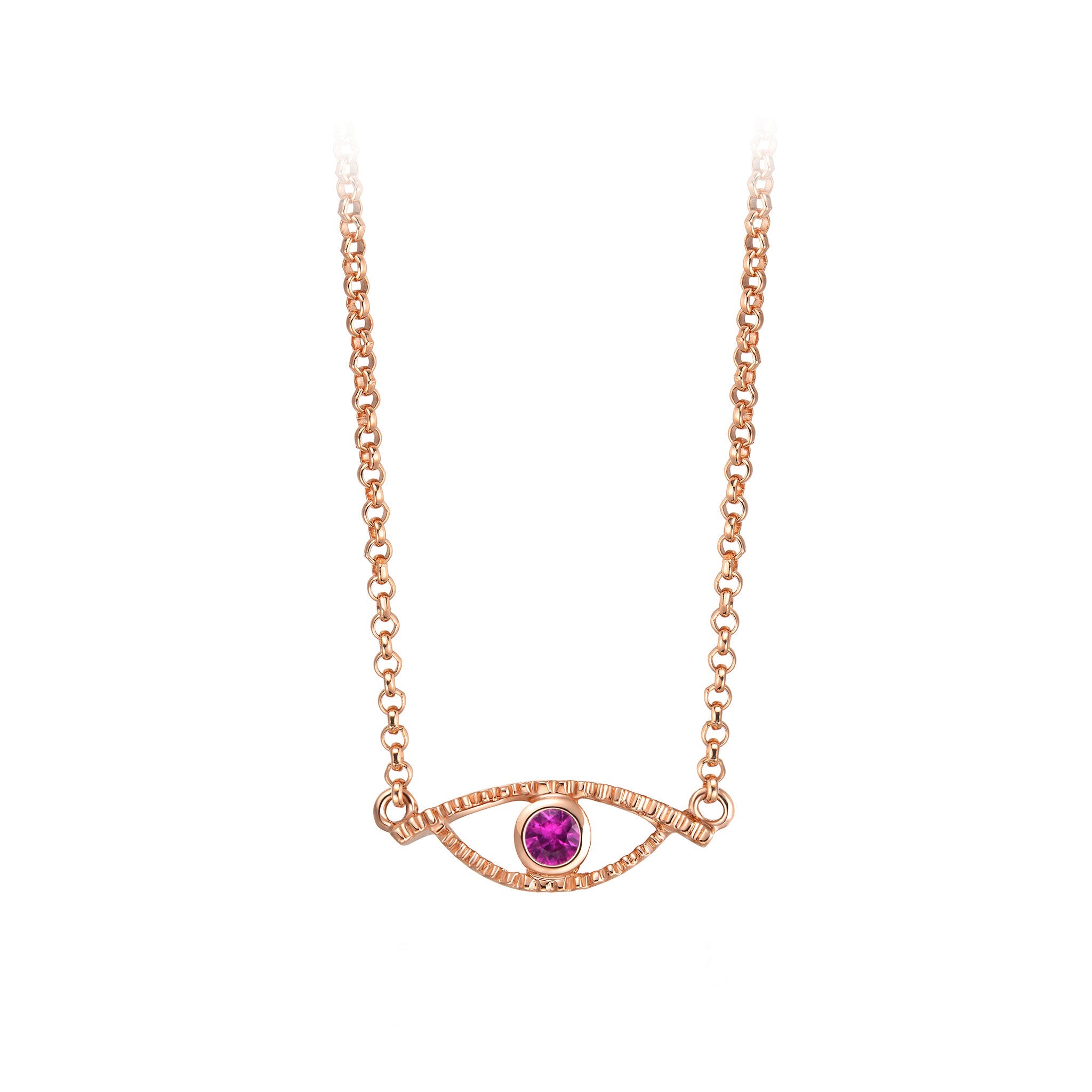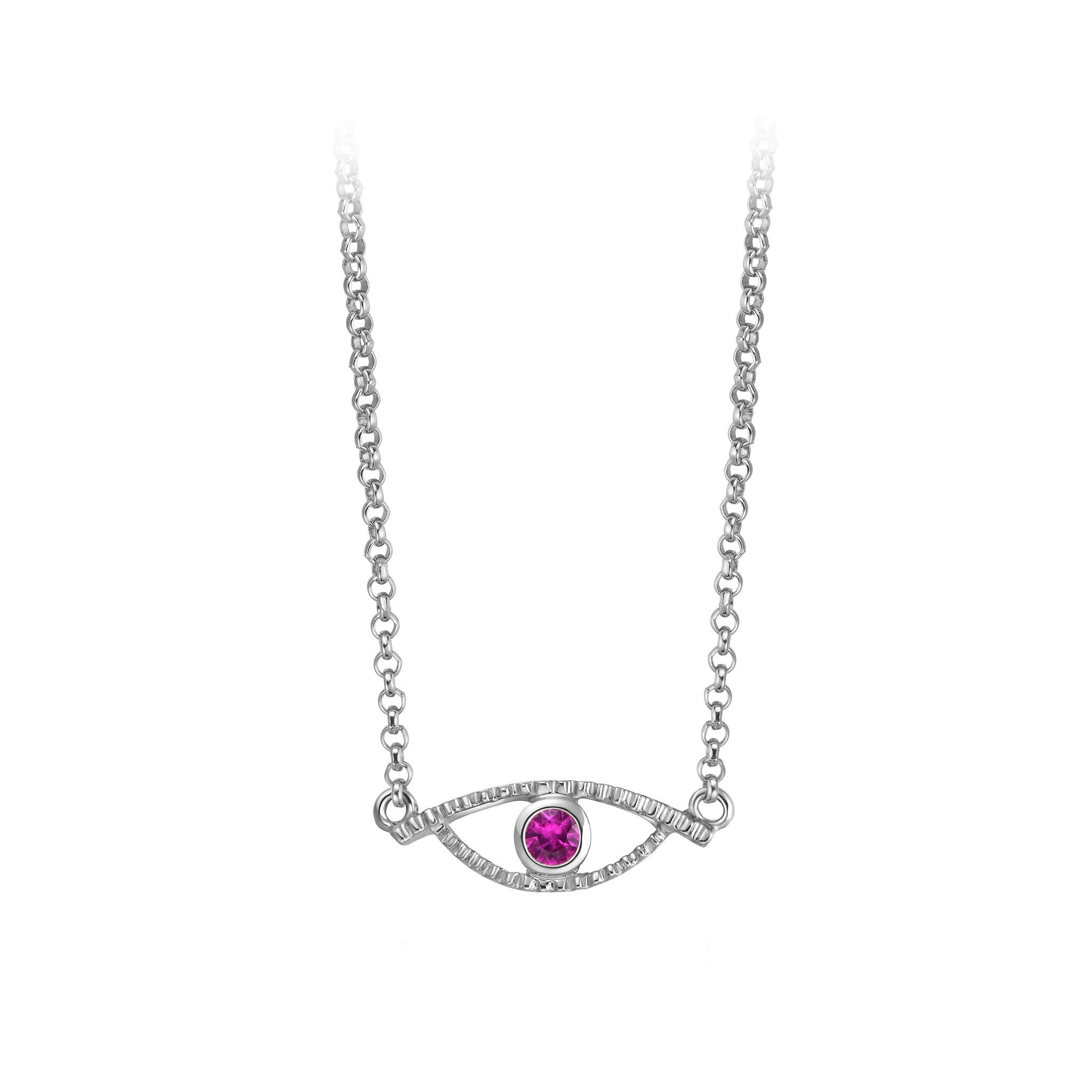 Worn like a modern amulet, the dainty Celestial Eye necklace brings its wearer both charm and positive energy. This simple design allows the Pink Sapphire centerpiece, which represents the power of friendship, to shine on its own.